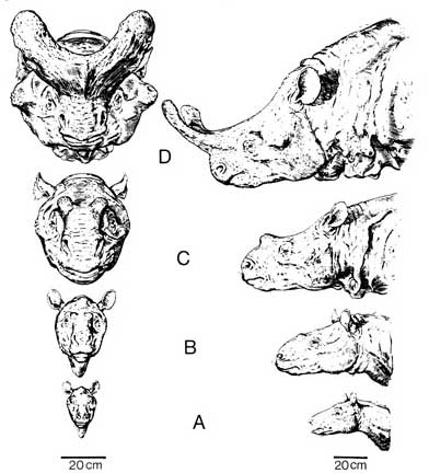| Obr. 4 Rekonstrukce několika druhů čeledi brototheriidae. A - Eotitanops, B - Manteoceras, C - Protitanotherium a D - Brontotherium |