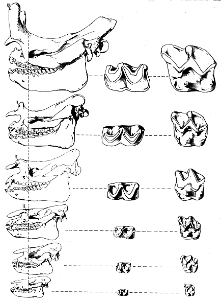 | Obr. 2 Vývoj lebky a zubů čeledi brontotheriidae. A - Brontotherium gigas (spodní oligocén), B - Brontotherium leidyl (nejspodnější oligocén), C - Protitanotherium emarginatum (pozdní eocén), D - Manteoceras manteoceras (střední eocén), E - Paleosyops priscus (střední/spodní eocén), F - Eotitanops borealis (spodní eocén) |