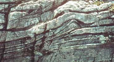 Ohýbání vrstev je dáno tzv. plastickou deformací. Horniny se totiž za určitých okolností chovají jako plastické! Pokud je hornina vystavena určitému tlaku dochází k deformaci. Deformace může být elastická, plastická nebo hornina může popraskat. U elastické deformace se po odstranění tlaku hornina vrátí do původní podoby. Tato deformace je tedy vratná. Plastická deformace je nevratná a hornina zůstane deformována trvale. Dochází ke strukturálním změnám horniny. Pokud je tlak příliš velký, může dojít také k popraskání hornin. To, jestli hronina praskne nebo se ohne, ovlivňuje několik okolností. Například teplota, tlak, složení horniny apod. Laboratorní experimenty ukázaly, že každá hornina vykazuje jiné charakteristiky. Má jinou mez elasticity nebo plasticity. Může se tedy stát, že v určitém souvrství dojde u jedné vrstvy k popraskání, kdežto vedlejší vrstva se ohne bez viditelných zlomů. Pokud je dostatek času a pokud v jeho průběhu není překročena mez plasticity, tak může dojít k velmi ostrým ohybům (viz Obr. 2)